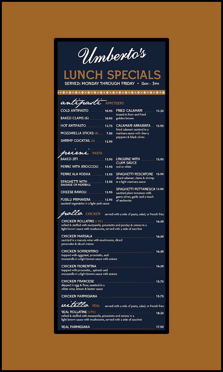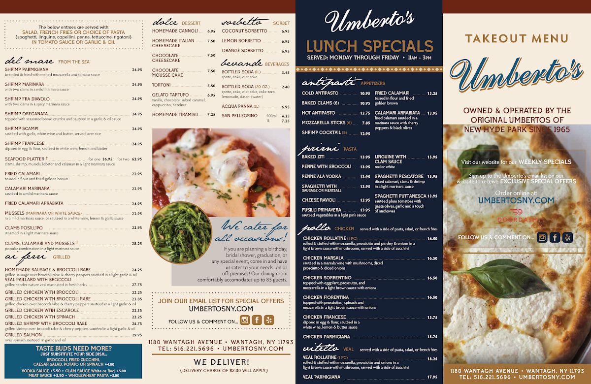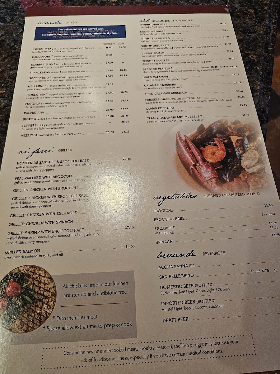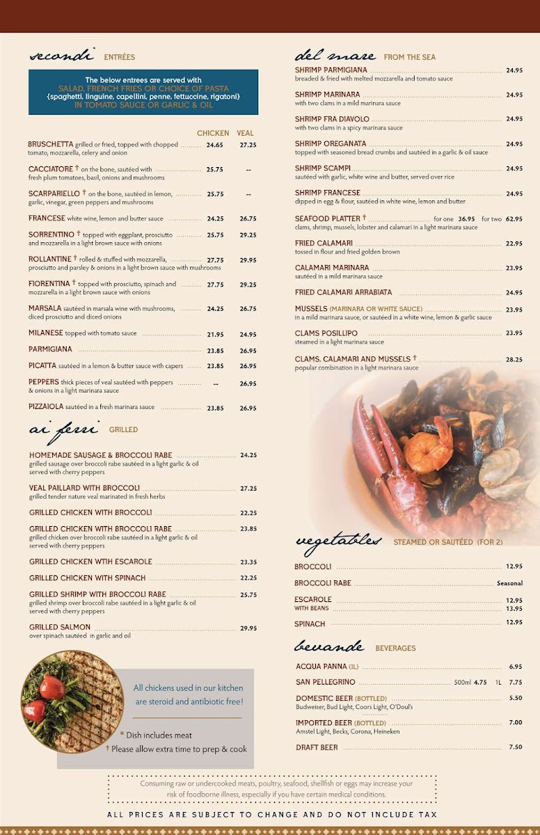 Chicken or veal parmigiana with your choice of side, including vegetables, various pastas, and multiple sauce options.